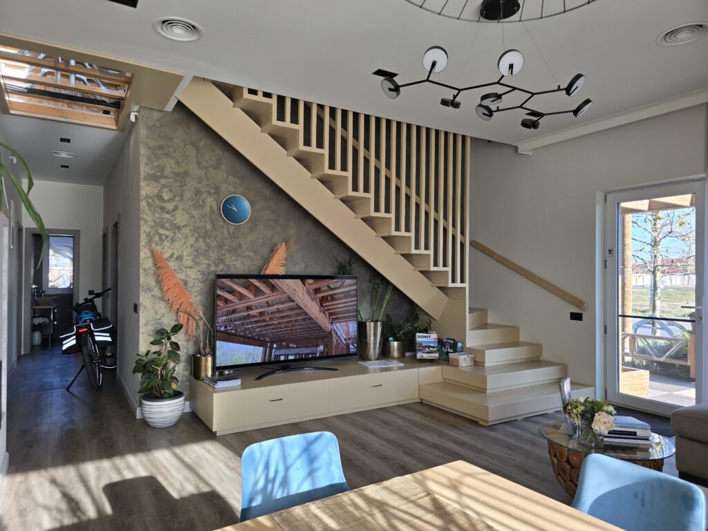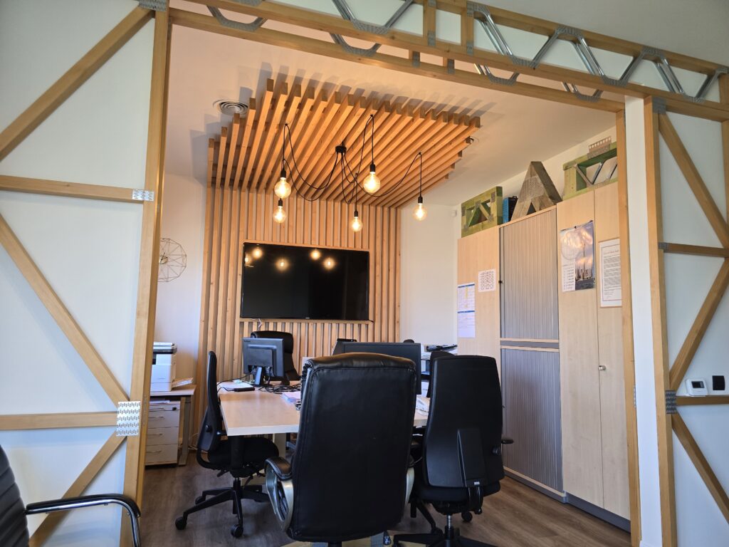 În incinta unității de producție, am construit o casă pe structură din lemn-tip showroom, unde clienții noștri sunt invitați „la noi acasă”, având posibilitatea să vadă pe viu o casă care îndeplinește toate standardele de performanță energetică și calitatea tuturor materialelor pe care le folosim.