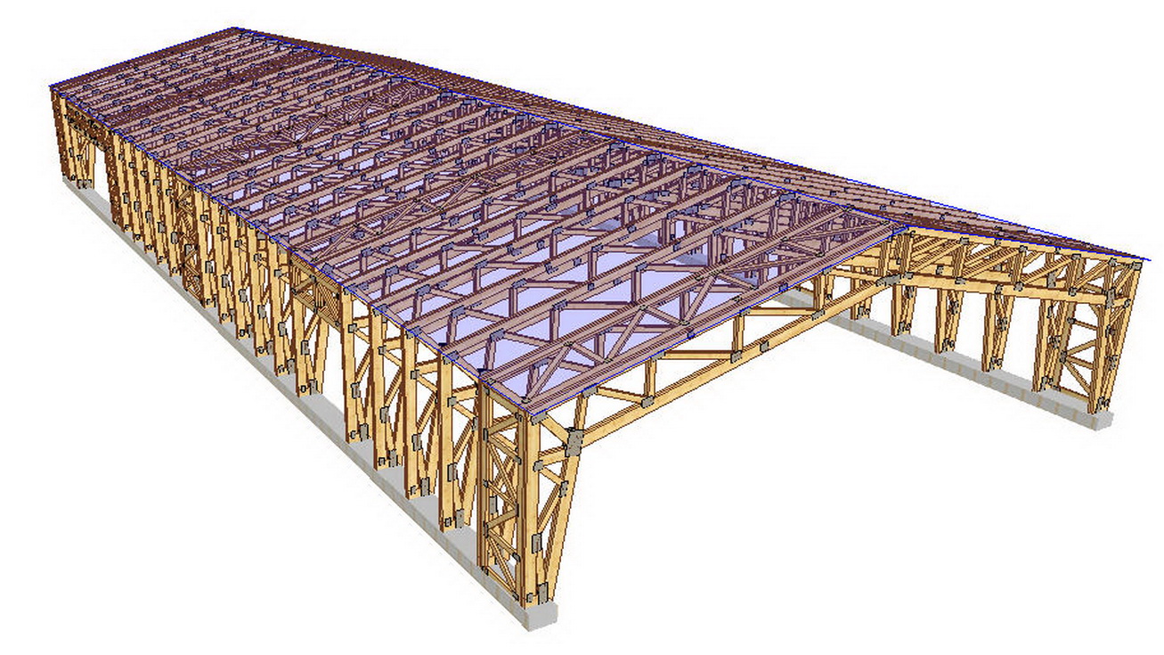 Sistemul constructiv al acestei hale este din grinzi cu zabrele din lemn tip portal cu picioare din lemn. Acest model de ferme pentru acoperis asigura o inaltime mare in partea centrala a halei de productie si un mare volum de aer.