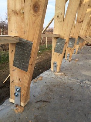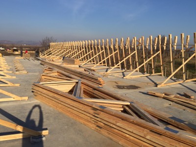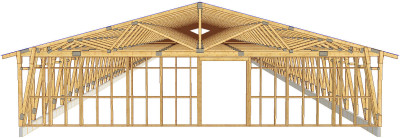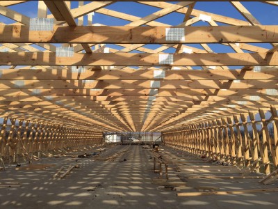 Structura inițială a construcției era prevazută din metal. Datorită analizei pe cost și timp de execuție, a reieșit ca beneficiarul a ales cea mai economică și sigură soluție, anume de a construi pe structură de grinzi prefabricate cu zăbrele asamblate cu plăci multicui MiTek (“sudura lemnului”).