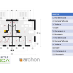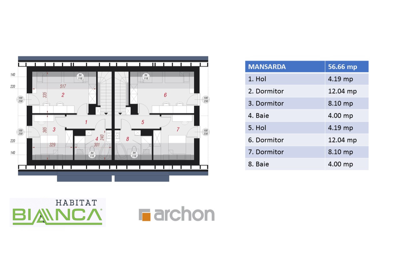 Scările aflate în spatele șemineului te duc la mansardă, unde există două dormitoare spațioase și o baie cu cadă. Este zona de odihnă și confort, care permite un control foarte bun al luminii care intră în încăperi și asigură un spațiu intim și plăcut.