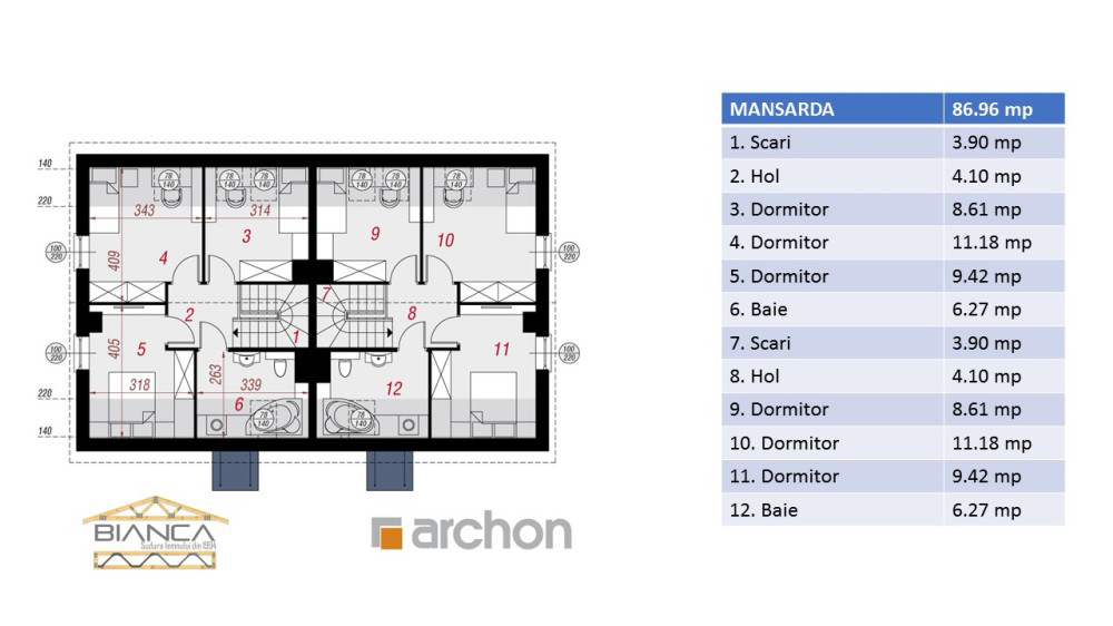 Scările aflate în spatele șemineului te duc la mansardă, unde există două dormitoare spațioase și o baie cu cadă. Este zona de odihnă și confort, care permite un control foarte bun al luminii care intră în încăperi și asigură un spațiu intim și plăcut.