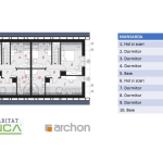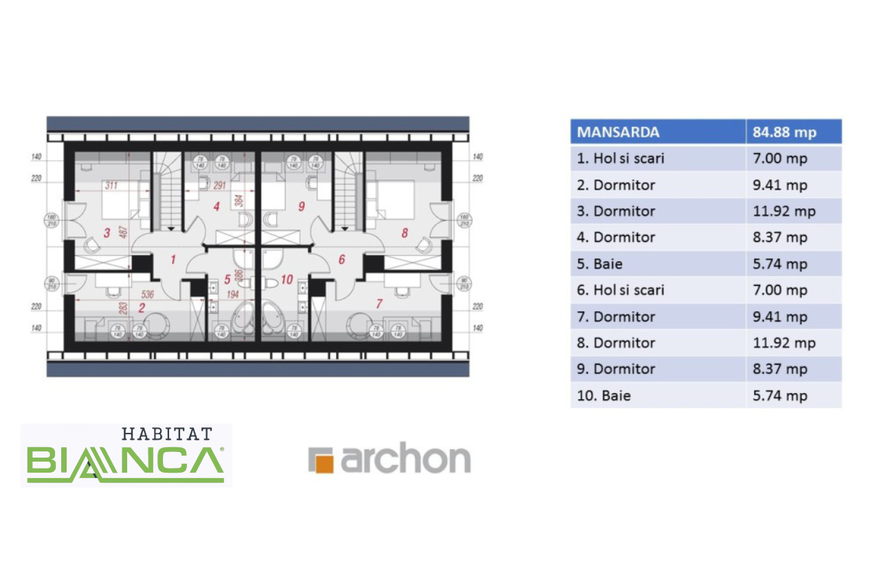 Este un P+M care la parter asigură un dormitor și o zonă open space foarte spațioasă din care se iese într-o terasă mare și verde, iar la etaj oferă 3 dormitoare încăpătoare. Spatiile utile numără două băi și o cameră tehnică în care se pot regăsi centrala sau mașina de spălat.