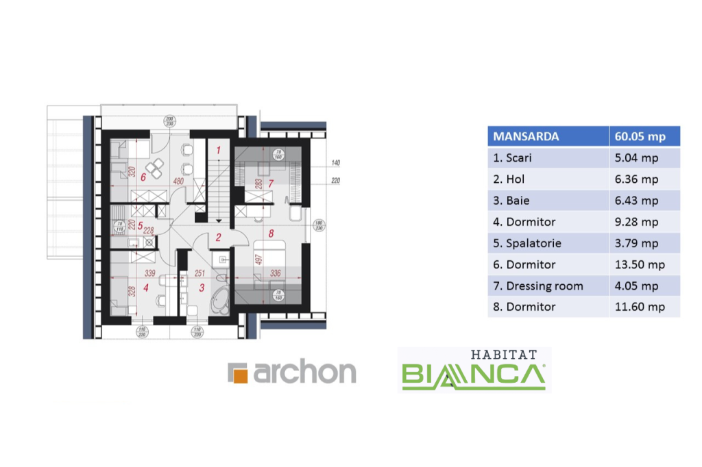 - Mansarda este dedicată zonelor de noapte. Cele 3 dormitoare oferă un spațiu intim și confortabil și sunt deservite de o baie și de un dressing room mare.