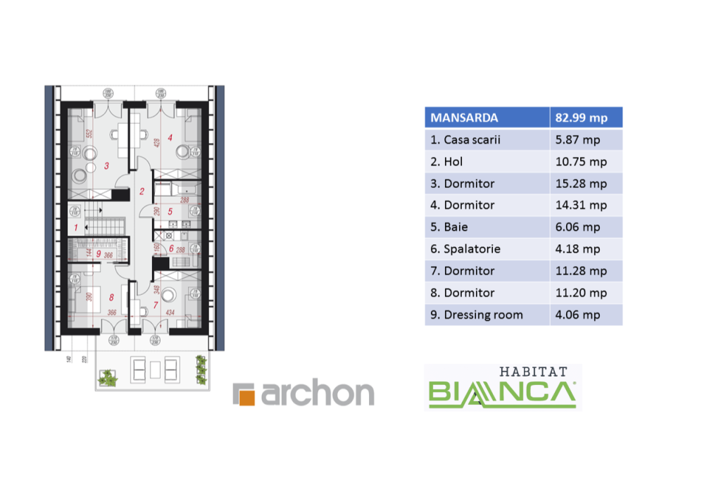 Mansarda este dedicată zonei de noapte și relaxare. Include: