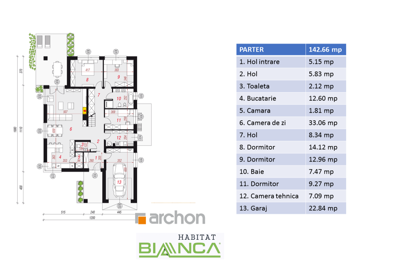 Parterul este zona în care se petrece cel mai mult timp, fiind compartimentat cu o cameră de zi, 3 dormitoare, o bucătărie spațioasă și un garaj generos.