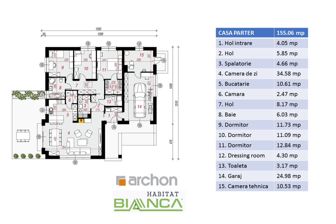 - Spații tehnice și de depozitare precum cămară, dressing și spălătorie, care eficientizează utilizarea fiecărui metru pătrat.
