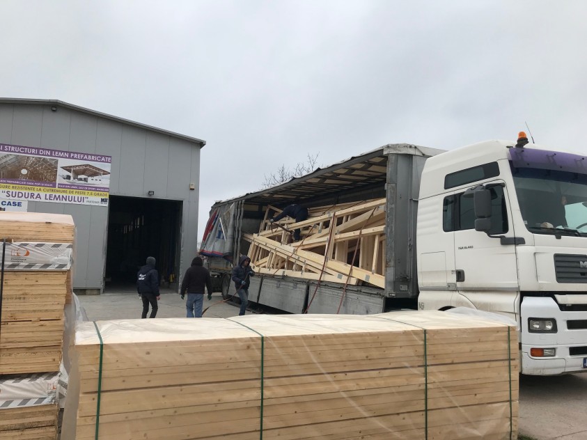 - Incarcarea structurii prefabricate din lemn in TIR pentru transport la beneficiar.